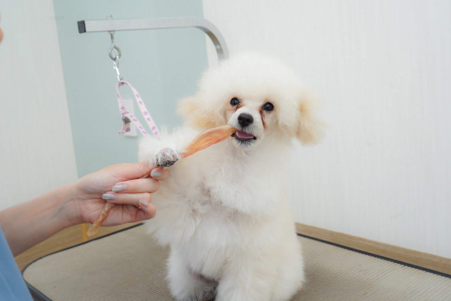 おやつをおぐもぐしながらトリミングすることです。