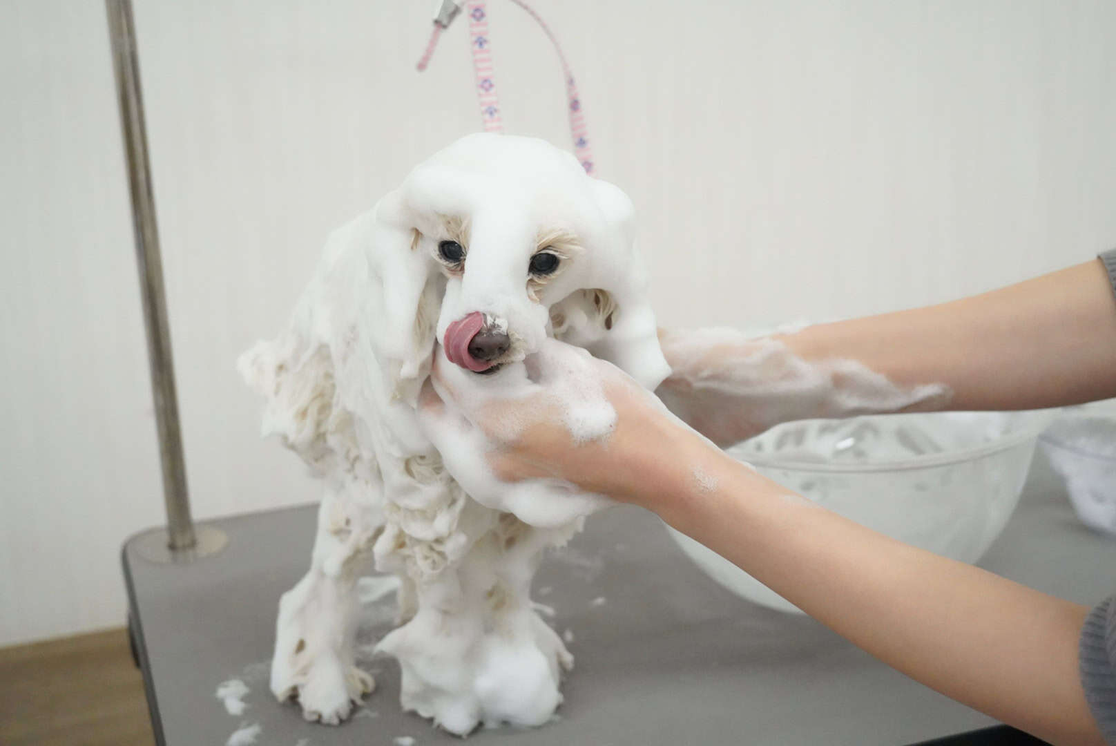 当店では大型犬のトリミングは2人体制で行います。